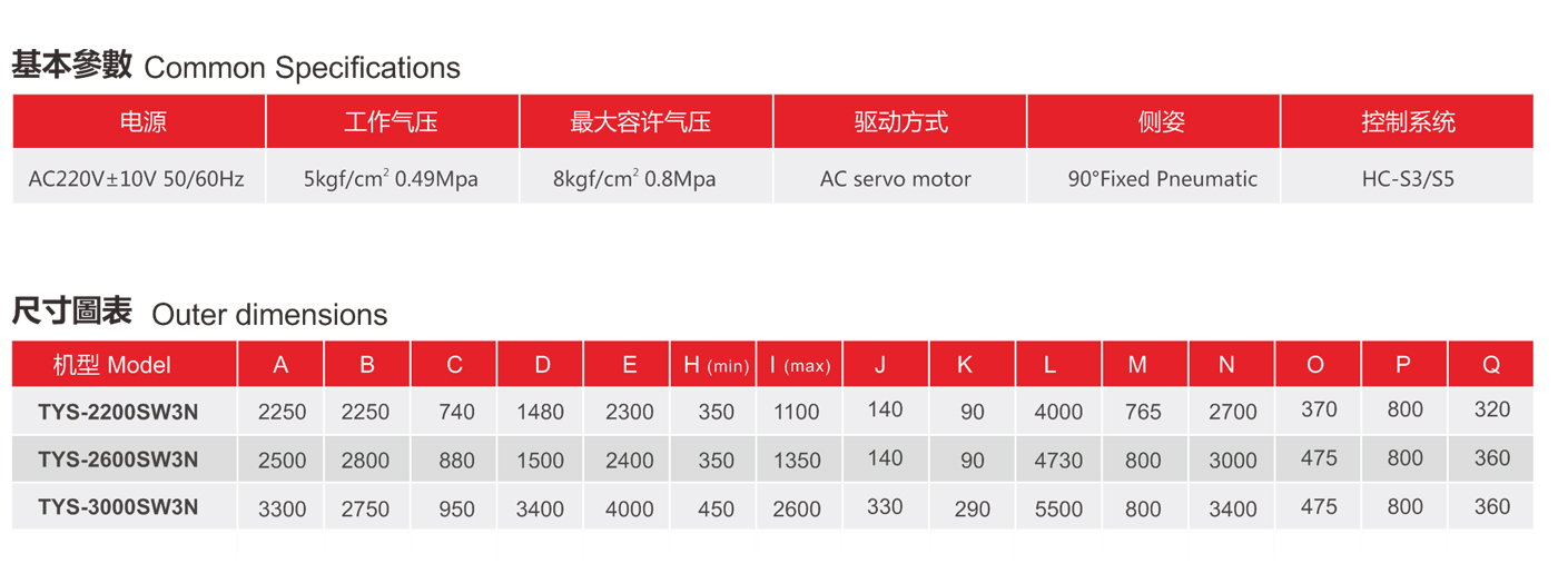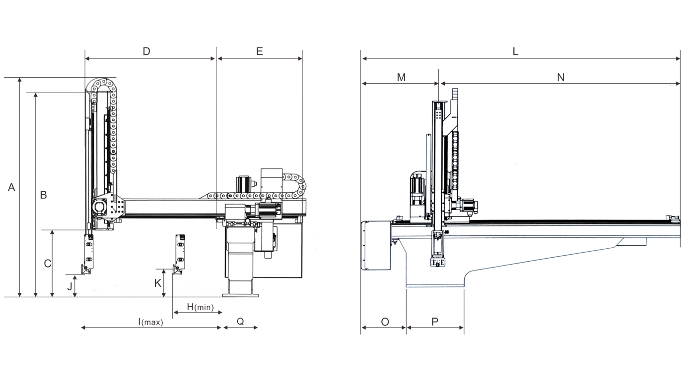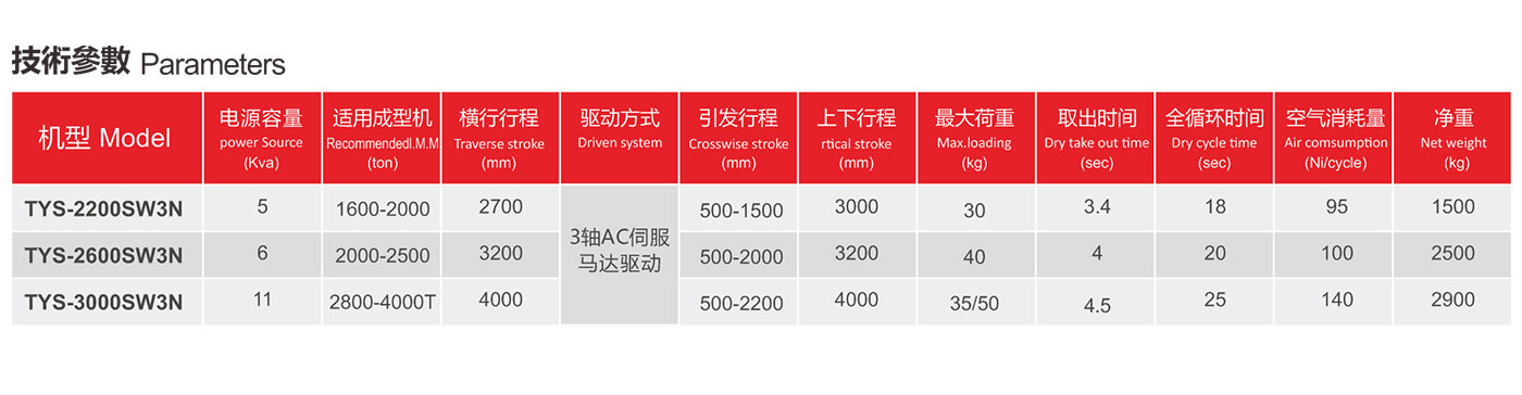 YS大型系列為升放式(牛頭式)機械手,標配為雙截開放式,三軸伺服驅動。伺服驅動優點:調試方便,運行速度快,動作平穩,使用壽命長。雙截式優點:減低機械手的整機高度,動作穩定性好,手臂上下速度快。引拔開放式;主要適用拿取長條型、面積大的塑膠產品(如汽車保險杠,地臺板等)。
