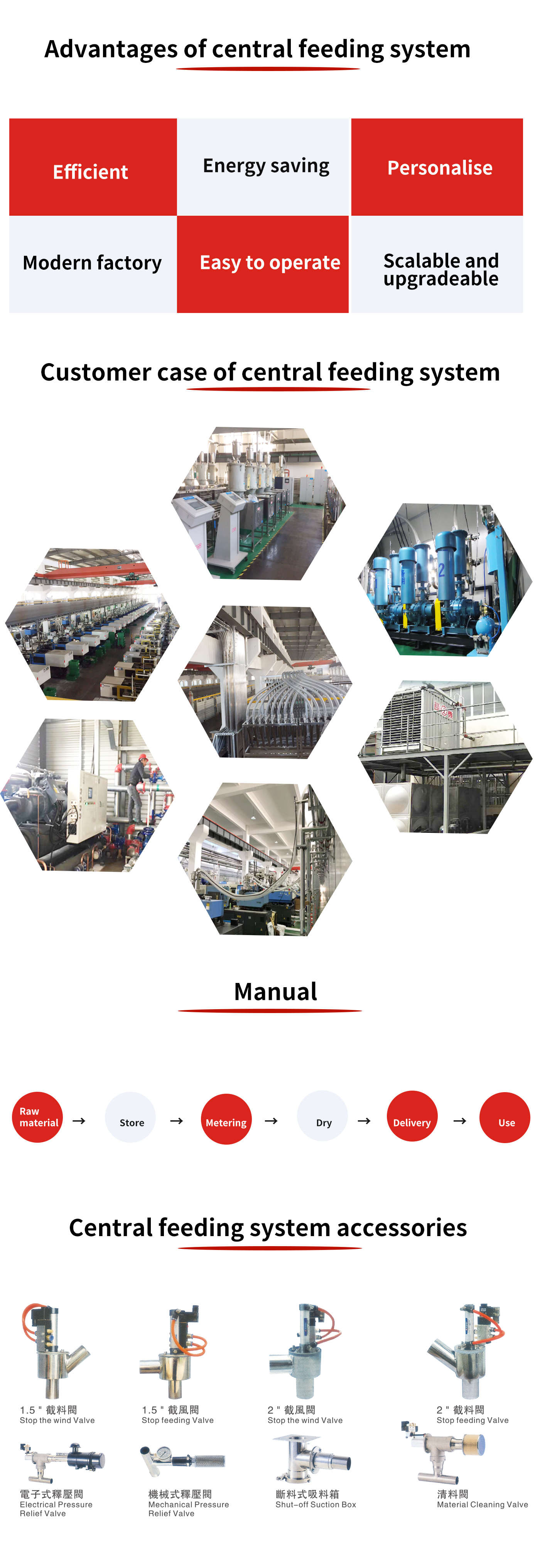 The main components of the central feeding system include: central control station, cyclone dust collector, pulsating dust collector, raw material distribution station, storage tank, mixer, dryer, dehumidifier, weighing mixer, central hopper, Pulverizers, machine-side pulverizers, manipulators, cut-off valves, cut-off valves, and feed pipes and air ducts, etc.